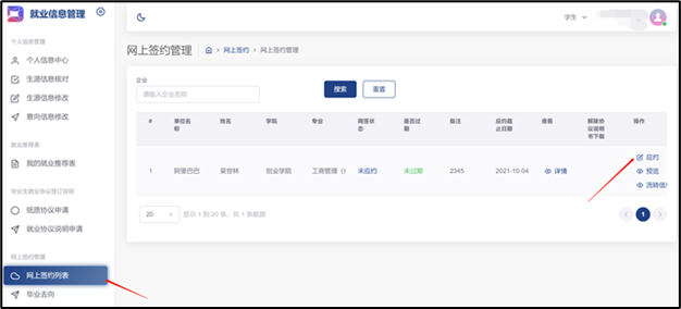 学生可在“网上签约中心-邀约信息中心”查看单位邀约信息,根据自己意愿选择应约单位;邀约信息有效期为14天,过期或选择应约其他企业,邀约信息将失效;毕业生一旦应约成功,代表甲乙双方签约事实形成,不得随意更改信息或解除协议。