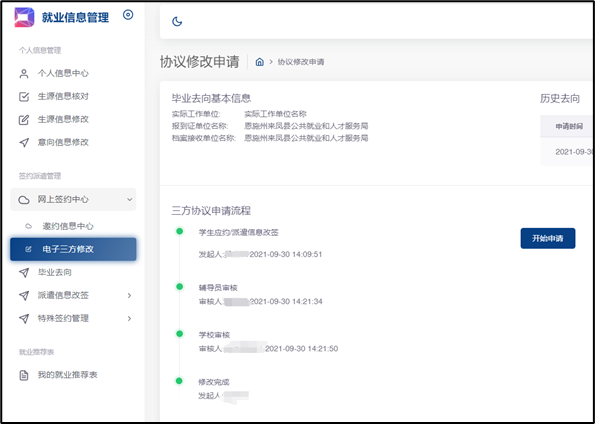 学生应约后,单位需要向学生出示一份盖章的情况说明,写清楚要修改的字段内容。学生在系统中点击进入“电子三方修改”模块,点击“开始申请”,提交盖章的情况说明并在系统中进行修改,经学校审核后完成修改。
